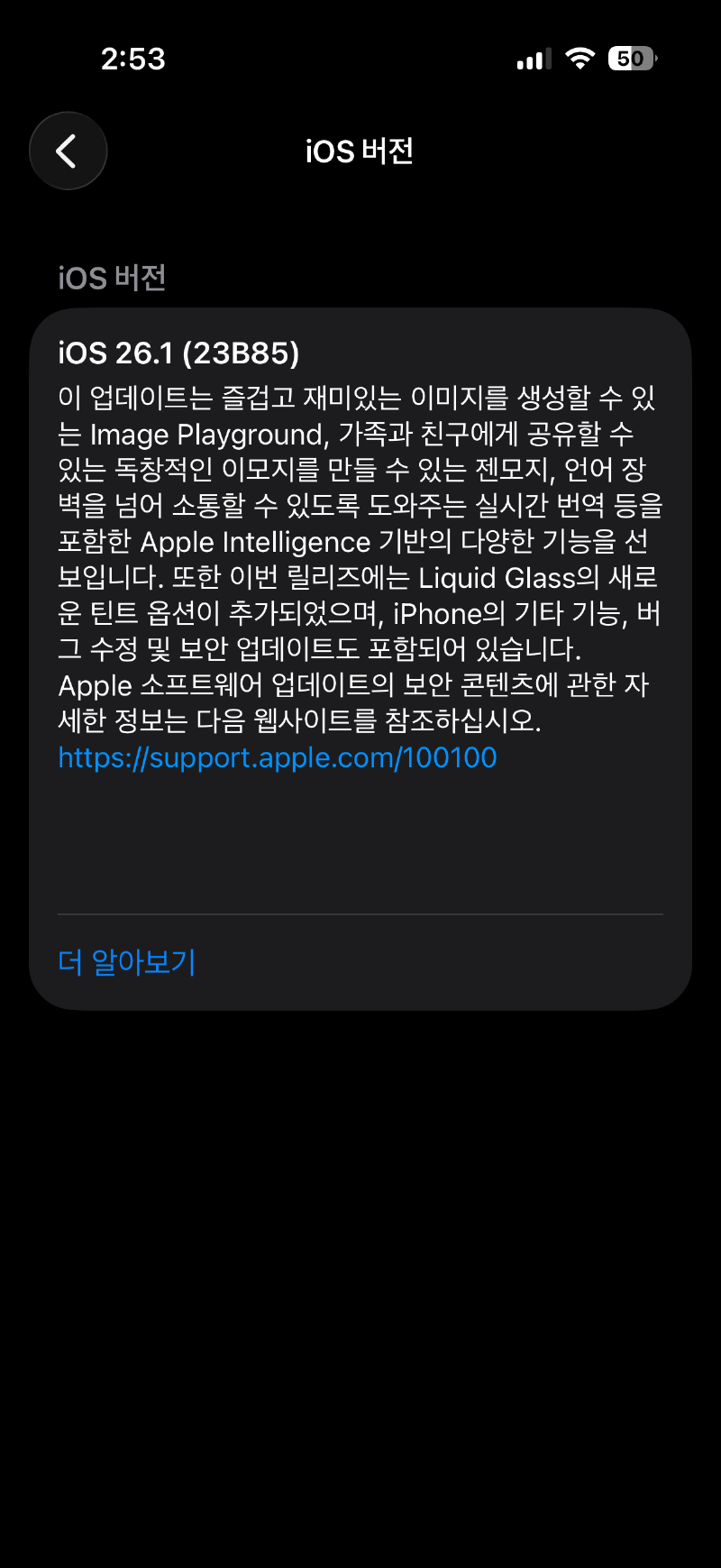 iOS 26.1 is an update that places the innovative features of iOS 26 onto a stable foundation. A powerful feature, real-time Korean translation, has been added, and the biggest weaknesses of the initial version—battery performance and screen readability—have been resolved.