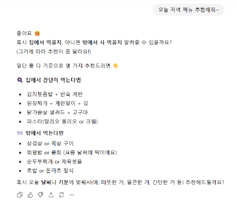 예를 들어 ChatGPT에게 “오늘 저녁 메뉴 추천해줘"라고 물어보면, 단순히 “김치찌개"라고 답하는 게 아니라 “날씨도 추운데 따뜻한 김치찌개는 어떠세요? 두부랑 돼지고기를 넣으면 더 맛있어요. 반찬으로는 계란말이나 김치전을 곁들이면 좋을 것 같네요"처럼 맥락을 이해하고 구체적으로 답변해줍니다.